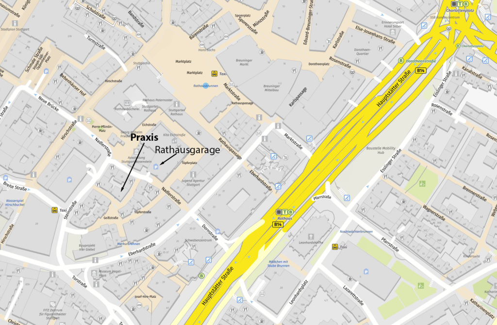 Die Praxis befindet sich im historischen Kern von Stuttgart am Hans-im-Glück-Brunnen in der Geißstr. 4.